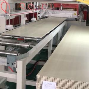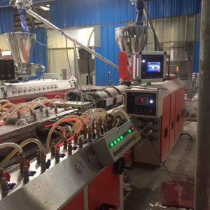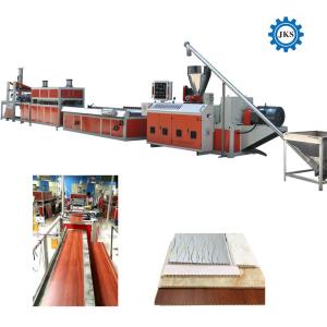 該生產(chǎn)線主要由錐形雙螺桿擠出機(jī),定型臺(tái),牽引機(jī),切割機(jī),自動(dòng)抬板機(jī)或料架組成。配合不同尺寸形狀的模具以及相應(yīng)的表面處理設(shè)備可生產(chǎn)出不同的PVC裝飾材料。