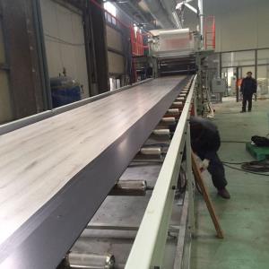 加入錐雙螺桿擠出機,進行加熱擠出→進入板材模頭進行擠出成型,成型的片材經(jīng)過四輥壓光機,基材進行定型→貼彩膜→貼耐磨層→冷卻→切割,這一系列工序在生產(chǎn)線上自動完成。